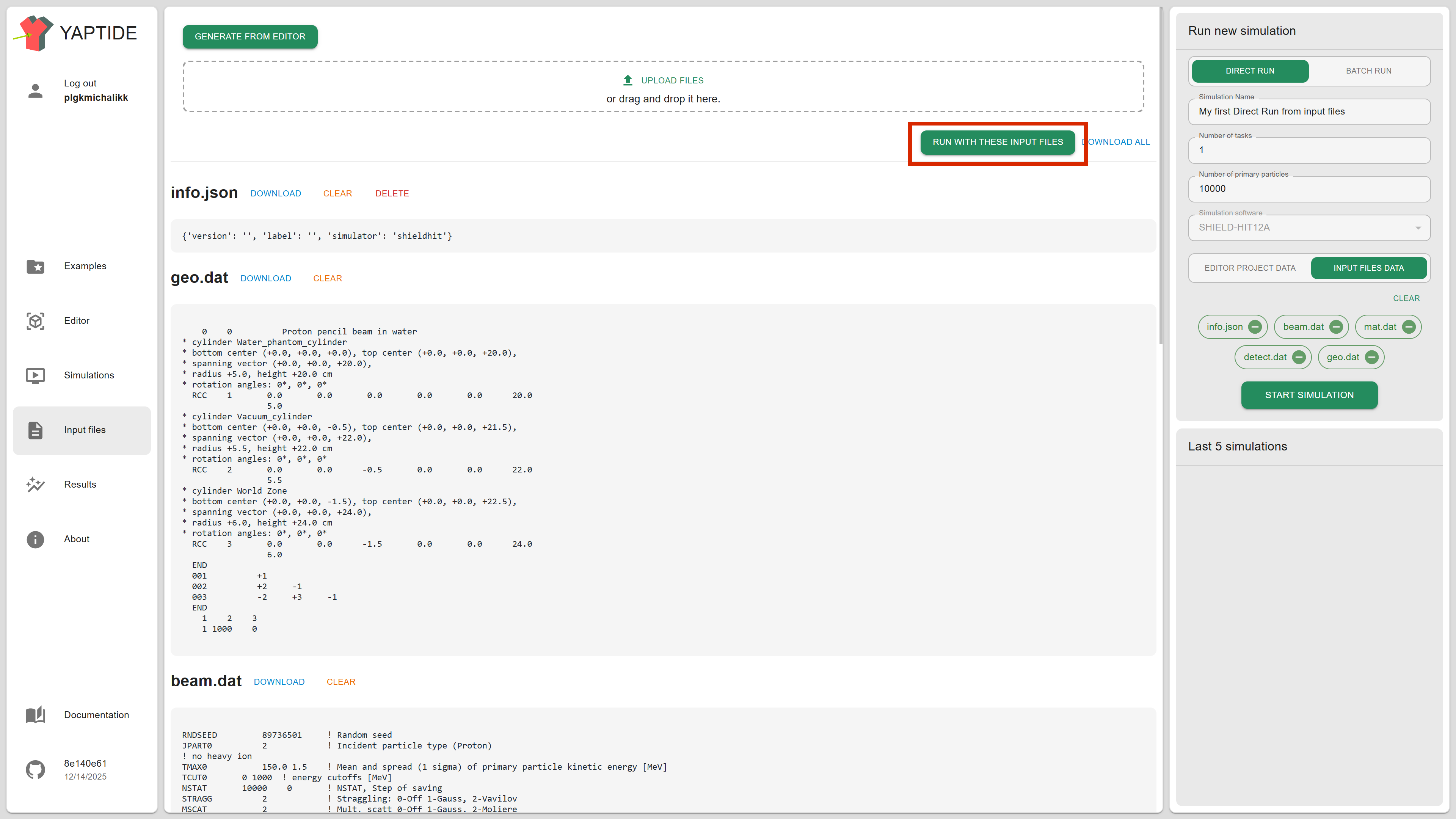 For convenience, the sidebar with sections 2. and 3. is pinned to Simulations, Input files, and Results pages. You can run and see recent simulations from each of these pages.